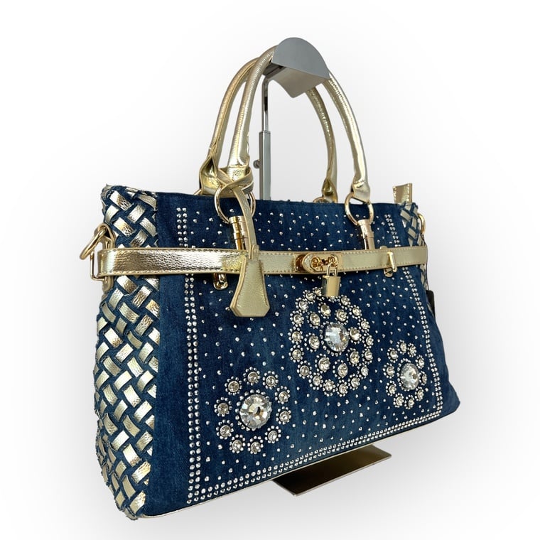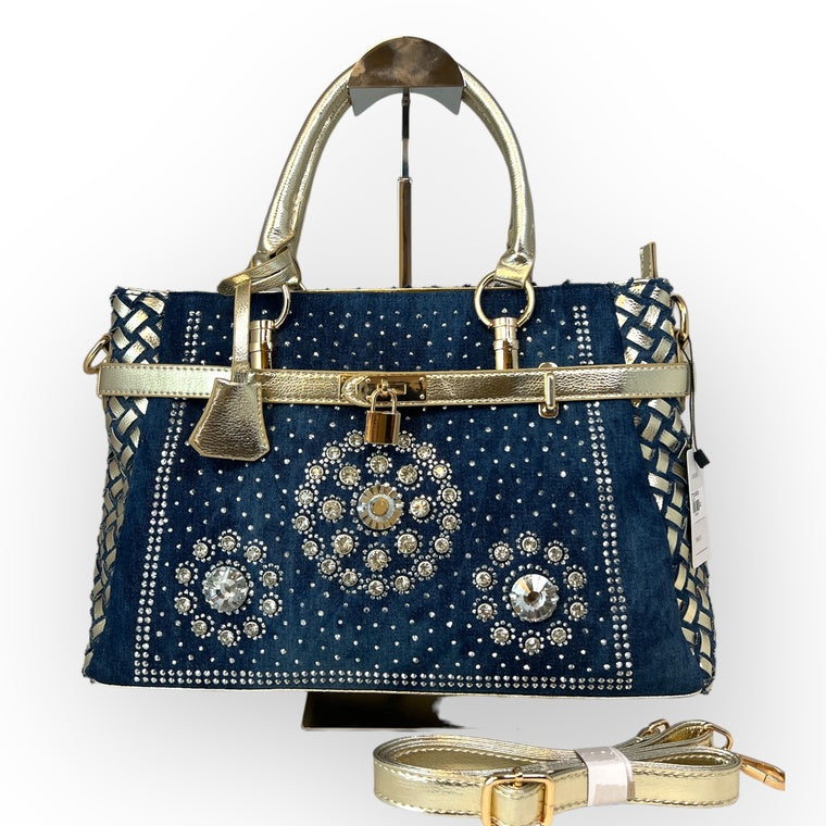 Elevate your style with this denim and gold rhinestone handbag featuring stunning crystal embellishments and luxe top handle design. Includes crossbody strap for versatile wear. Shop now!
