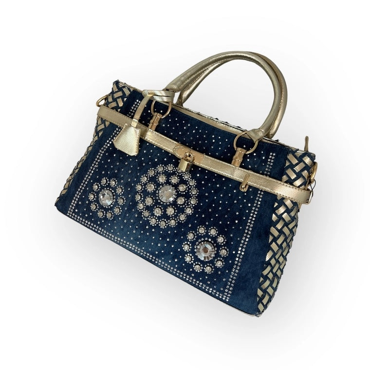 A stunning fusion of rich denim and radiant gold, this structured satchel is designed for the woman who loves timeless style with a bold, glamorous twist. Intricate crystal embellishments form eye-catching circular patterns across the front, creating dimension, brilliance, and that “where did you get that?” effect.
