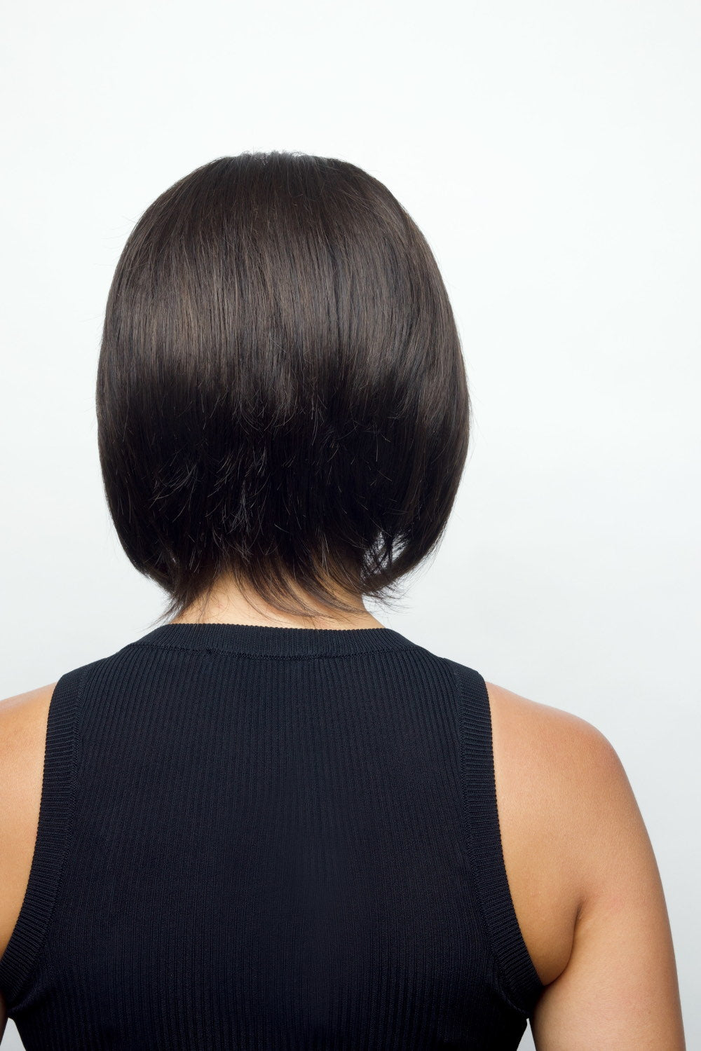 Jolie from the Noriko Collection is a short-length synthetic wig. This straight ready-to-wear wig is a perfectly layered modern bob. This sleek bob is a timeless refined hairstyle.