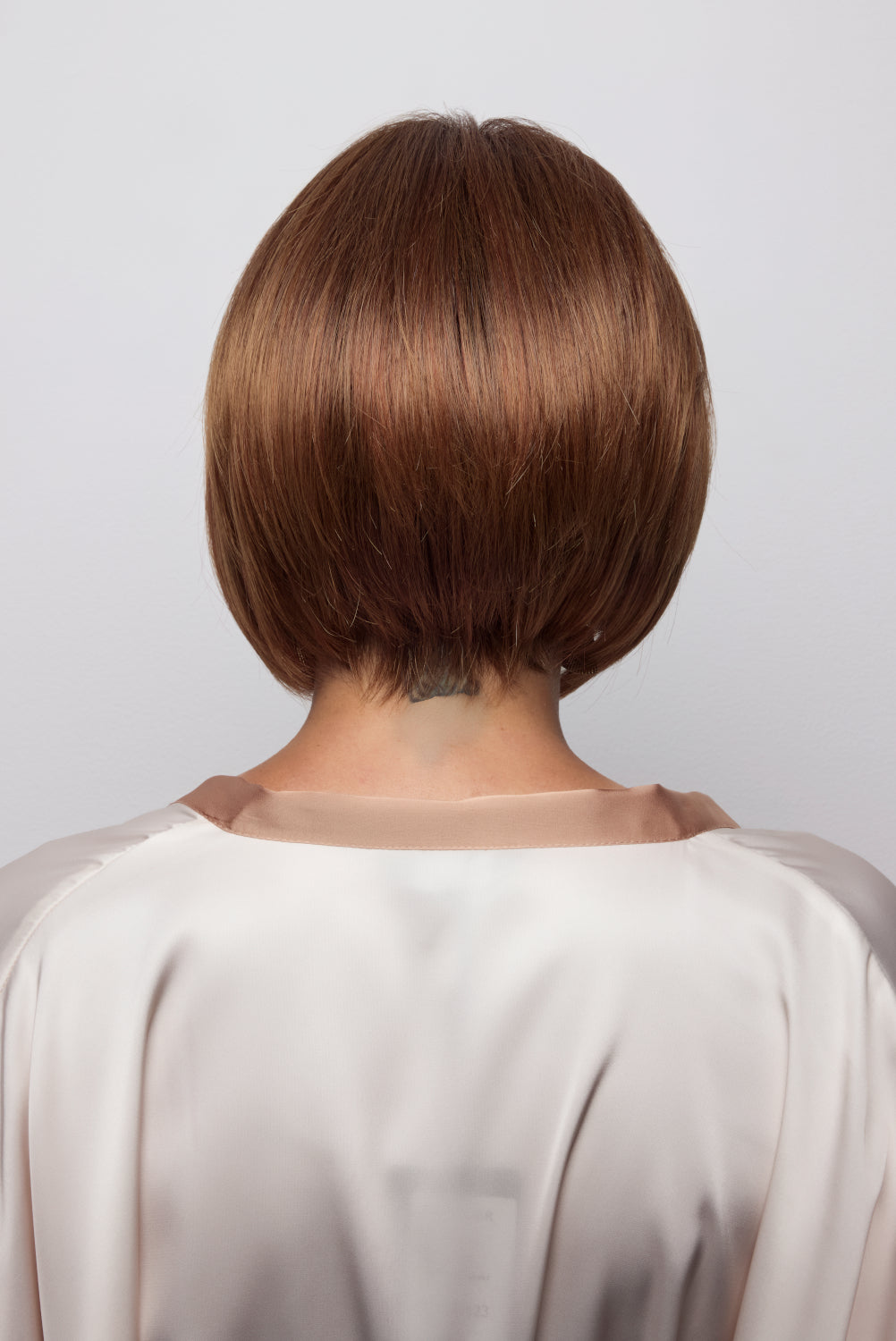 Ayumi from the Noriko Collection is a short-length blended fiber wig. This straight, ready-to-wear bob features a chic center part and a softly graduated shape that frames the neckline with elegance. Long, invisible face-framing layers and medium density create a polished yet versatile style, perfect for everyday wear or special occasions.