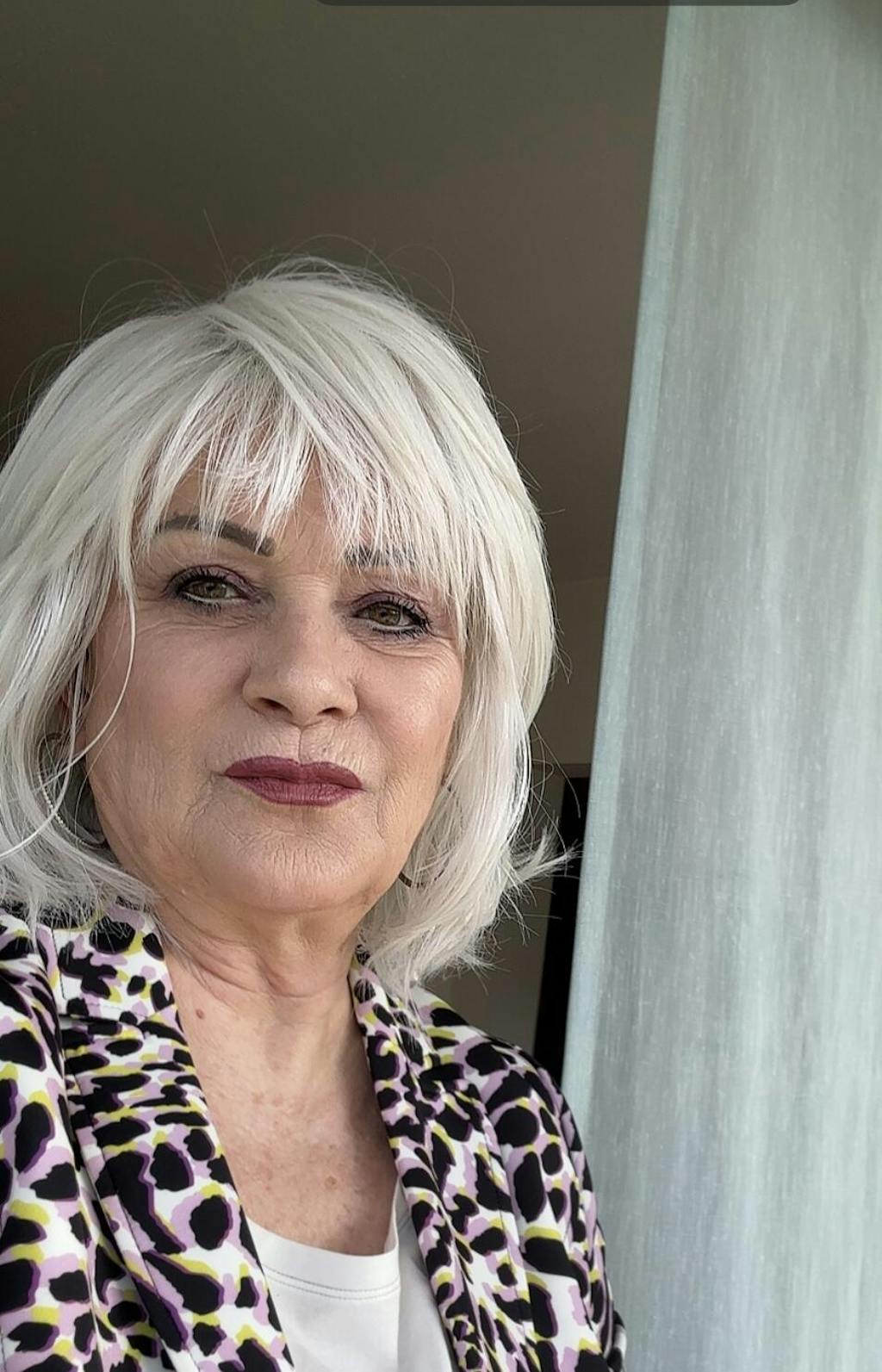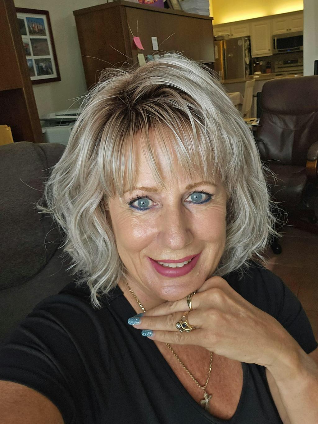 This wig has a beautiful layered cut, the fibers are fine and move naturally. I cut the bangs a little and I think I will wear this one a lot.