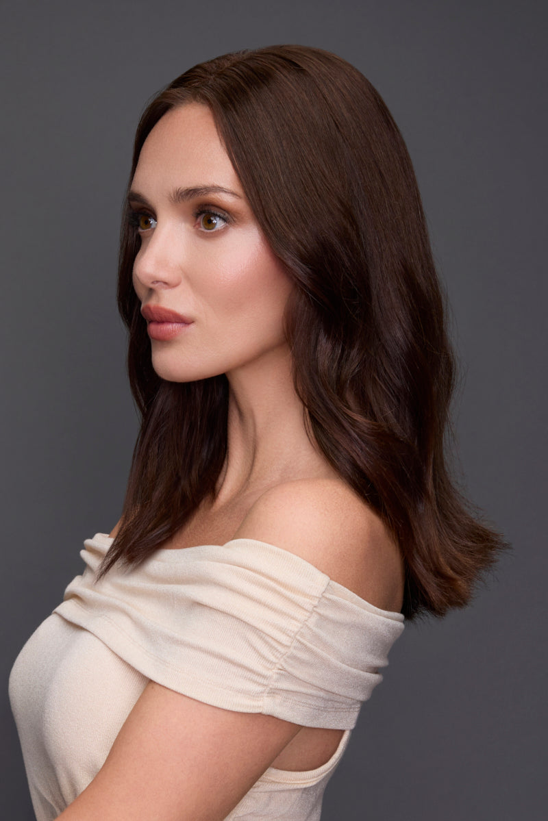 Designed for those who love the original easiPart Medium, the easiPart Medium Human Hair 14” topper introduces highly requested updates that deliver fuller coverage, improved blendability, and greater versatility, without changing the easiPart look and feel customer's trust. This updated design features a full 14” hair length throughout, rather than a tapered 12” length, creating a noticeably more balanced and voluminous result. It also returns to Jon Renau’s signature 50% Indian / 50% Chinese Remy human hair blend, offering consistent quality, softness, and natural movement, along with the addition of RN color options for endless customization options.