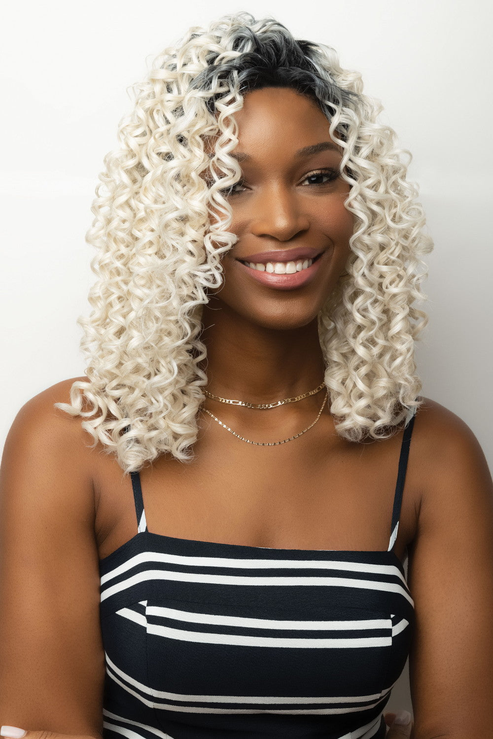 This curly ready-to-wear wig is a voluminous shoulder length wig.